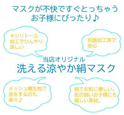 待望のお子様用マスク! 涼やか洗える絹マスクが登場! 【当店オリジナル仕様】 抗菌&キシリトール加工 布製 洗える絹マスク 柄入り 夏用 特殊メッシュ織 肌に優しいシルクのマスク。